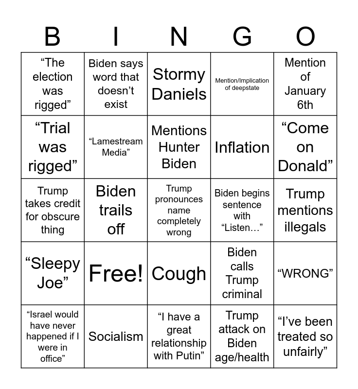 This bingo card has 25 words: Free!, “I have a great relationship with Putin”, Mentions Hunter Biden, “Israel would have never happened if I were in office”, Mention of January 6th, “The election was rigged”, “Trial was rigged”, Biden says word that doesn’t exist, Biden begins sentence with “Listen…”, Cough, Inflation, Trump takes credit for obscure thing, Biden calls Trump criminal, “WRONG”, “Lamestream Media”, “I’ve been treated so unfairly”, Trump mentions illegals, Stormy Daniels, “Come on Donald”, Biden trails off, Trump pronounces name completely wrong, Socialism, “Sleepy Joe”, Mention/Implication of deepstate and Trump attack on Biden age/health.