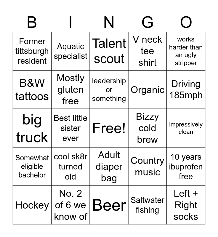 This bingo card has a free space and 24 words: cool sk8r turned old, No. 2 of 6 we know of, leadership or something, Hockey, works harder than an ugly stripper, Former tittsburgh resident, B&W tattoos, Aquatic specialist, Bizzy cold brew, Adult diaper bag, Organic, big truck, Country music, 10 years ibuprofen free, Mostly gluten free, Saltwater fishing, impressively clean, Talent scout, Driving 185mph, Best little sister ever, Left + Right socks, Somewhat eligible bachelor, V neck tee shirt and Beer.