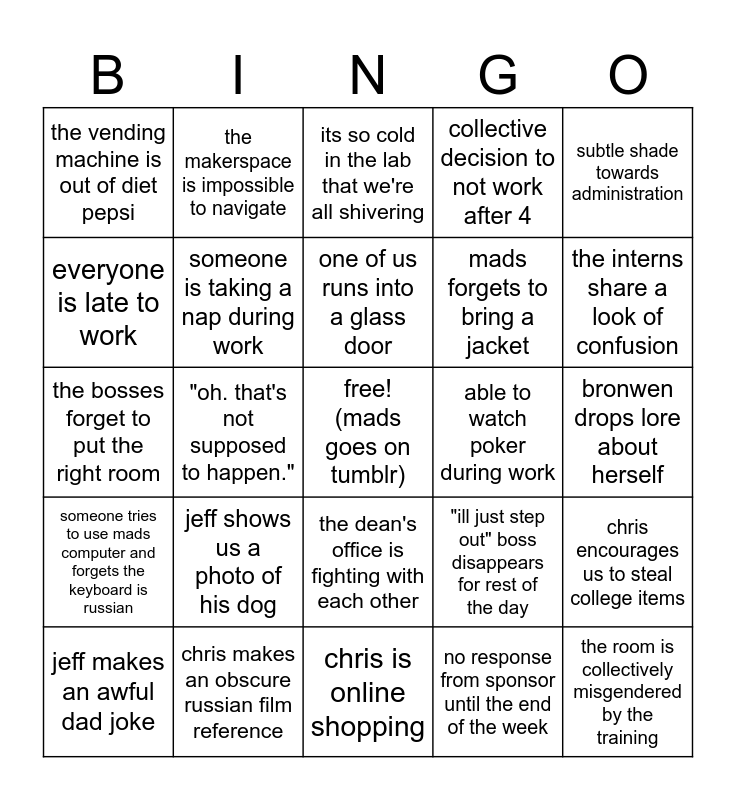 This bingo card has a free space and 30 words: chris makes an obscure russian film reference, "it'll be a little tight in there", "oh. that's not supposed to happen.", wevideo breaks, the vending machine is out of diet pepsi, its so cold in the lab that we're all shivering, someone is taking a nap during work, the dean's office is fighting with each other, able to watch poker during work, chris is online shopping, bronwen drops lore about herself, the room is collectively misgendered by the training, no response from sponsor until the end of the week, mads somehow learned this program in high school, the interns share a look of confusion, jeff is sent on an errand, "ill just step out" boss disappears for rest of the day, someone tries to use mads computer and forgets the keyboard is russian, jeff shows us a photo of his dog, subtle shade towards administration, the bosses forget to put the right room, let free 5-10 minutes before end of work, the makerspace is impossible to navigate, mads forgets to bring a jacket, everyone is late to work, collective decision to not work after 4, chris encourages us to steal college items, jeff makes an awful dad joke, one of us runs into a glass door and "mads. can you use the drill?".