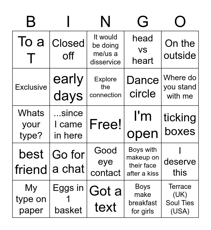 This bingo card has a free space and 24 words: Go for a chat, Eggs in 1 basket, Explore the connection, My type on paper, On the outside, To a T, Exclusive, Closed off, I'm open, Good eye contact, Dance circle, Whats your type?, Boys with makeup on their face after a kiss, I deserve this, early days, Boys make breakfast for girls, ticking boxes, It would be doing me/us a disservice, Where do you stand with me, ...since I came in here, Terrace (UK) Soul Ties (USA), best friend, head vs heart and Got a text.