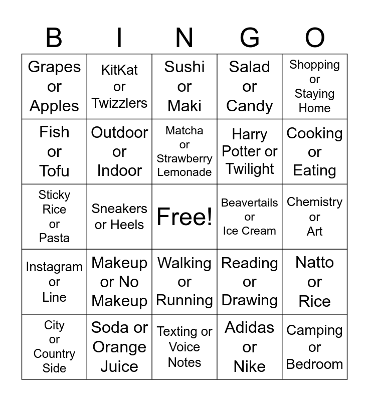 This bingo card has a free space and 29 words: City or Country Side, Disney or Netflix, Sneakers or Heels, Homeless or No Homeless, Grapes or Apples, Sushi or Maki, Outdoor or Indoor, Makeup or No Makeup, Beavertails or Ice Cream, Soda or Orange Juice, Chemistry or Art, Camping or Bedroom, Texting or Voice Notes, Adidas or Nike, Cooking or Eating, Inside out or Trolls, Walking or Running, Instagram or Line, Shopping or Staying Home, Sticky Rice or Pasta, Reading or Drawing, Studying or Movies, Harry Potter or Twilight, Fish or Tofu, Salad or Candy, KitKat or Twizzlers, Natto or Rice, Matcha or Strawberry Lemonade and Coffee or Tea.