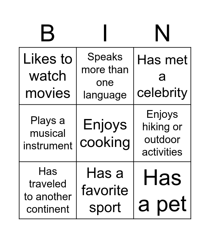 This bingo card has a free space and 14 words: Has a birthday this month, Loves to read books, Has traveled to another continent, Speaks more than one language, Plays a musical instrument, Has a pet, Likes to dance, Has lived in another country, Has a favorite sport, Likes to watch movies, Has a large family, Enjoys hiking or outdoor activities, Has met a celebrity and Loves coffee or tea.