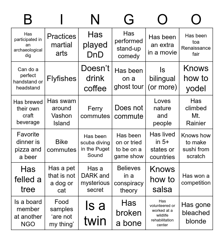 This bingo card has 36 words: Believes in a conspiracy theory, Has a DARK and mysterious secret, Has broken a bone, Can do a perfect handstand or headstand, Favorite dinner is pizza and a beer, Does not commute, Flyfishes, Is a twin, Has been an extra in a movie, Knows how to salsa, Knows how to yodel, Has performed stand-up comedy, Has won a competition, Has swam around Vashon Island, Has been on a ghost tour, Has participated in an archaeological dig, Has felled a tree, Loves nature and people, Has brewed their own craft beverage, Has played DnD, Ferry commutes, Bike commutes, Has been on or tried to be on a game show, Has been scuba diving in the Puget Sound, Has lived in 5+ states or countries, Practices martial arts, Is bilingual (or more), Food samples ‘are not my thing’, Doesn’t drink coffee, Has been toa Renaissance fair, Has gone bleached blonde, Is a board member at another NGO, Knows how to make sushi from scratch, Has climbed Mt. Rainier, Has a pet that is not a dog or cat and Has volunteered or worked at a wildlife rehabilitation center.