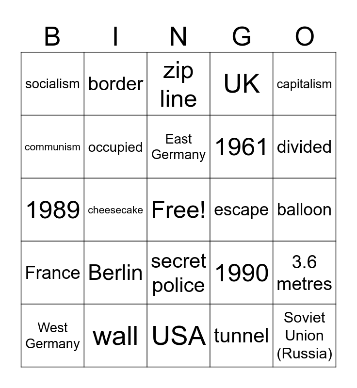 This bingo card has a free space and 24 words: Berlin, wall, East Germany, West Germany, capitalism, socialism, communism, border, escape, secret police, 1961, 1989, 1990, 3.6 metres, occupied, tunnel, balloon, zip line, divided, cheesecake, Soviet Union (Russia), France, UK and USA.