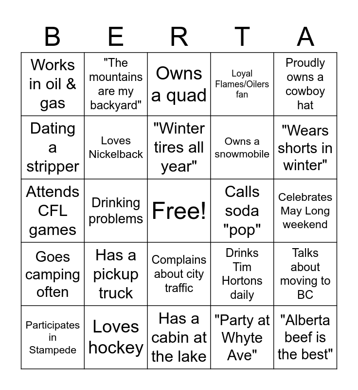 This bingo card has a free space and 24 words: Has a pickup truck, Loves hockey, "Winter tires all year", Participates in Stampede, Proudly owns a cowboy hat, Works in oil & gas, Dating a stripper, "The mountains are my backyard", Calls soda "pop", Complains about city traffic, Owns a snowmobile, Attends CFL games, Drinks Tim Hortons daily, Talks about moving to BC, Loves Nickelback, "Party at Whyte Ave", Celebrates May Long weekend, Owns a quad, "Wears shorts in winter", Drinking problems, "Alberta beef is the best", Goes camping often, Loyal Flames/Oilers fan and Has a cabin at the lake.