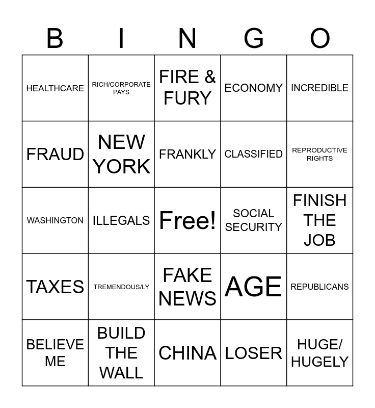 This bingo card has a free space and 45 words: MAGA, HUGE/ HUGELY, A MADE-UP WORD, BELIEVE ME, STUPID, LOSER, FIRE & FURY, GREAT, INCREDIBLE, BUILD THE WALL, ECONOMY, SOCIAL SECURITY, FAKE NEWS, TREMENDOUS/LY, CONGRESS, CHINA, MILLIONS/ BILLIONS, WASHINGTON, CLASSY, REPRODUCTIVE RIGHTS, RICH/CORPORATE PAYS, ZERO, WINNING/LY, HEALTHCARE, JANUARY 6TH, FINISH THE JOB, STORMY DANIELS, HUSH MONEY, AGE, TAXES, STUDENT DEBT, REPUBLICANS, DEMOCRATS, SHRINKFLATION, IMMIGRATION, ILLEGALS, BORDER, WHAT DO YOU GOT TO LOSE, WHAT CAN I SAY, FRANKLY, FRAUD, CLASSIFIED, MAR-A-LAGO, NEW YORK and TRIAL(S).