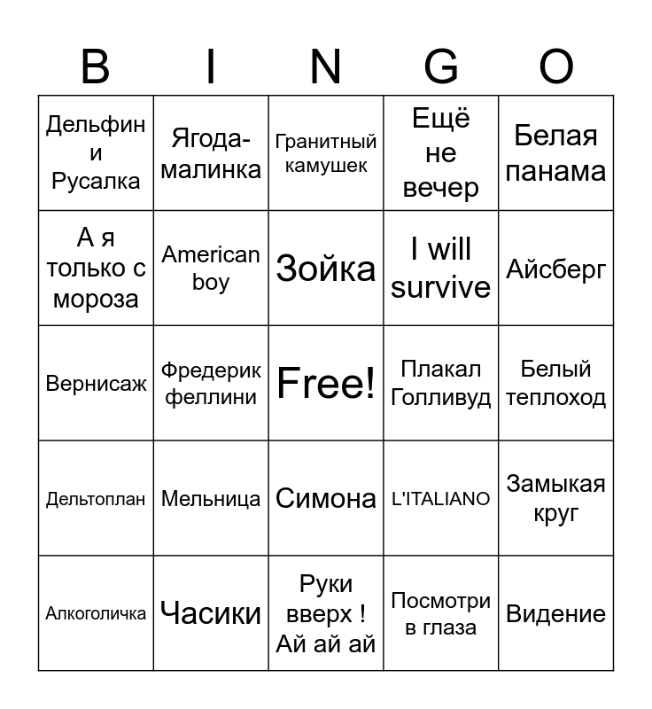 This bingo card has a free space and 29 words: Алкоголичка, Белые розы, Фредерик феллини, Despacito, Дельфин и Русалка, Гранитный камушек, American boy, Мельница, Плакал Голливуд, Часики, Белый теплоход, Видение, Руки вверх ! Aй ай ай, Посмотри в глаза, Айсберг, Good-bye,мой мальчик, Симона, Дельтоплан, Белая панама, Вернисаж, L'ITALIANO, Искала тебя, I will survive, А я только с мороза, Ещё не вечер, Ягода-малинка, Замыкая круг, Зойка and Край, мой ридный край.