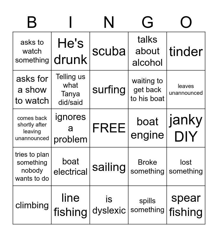 This bingo card has a free space and 24 words: boat electrical, line fishing, surfing, climbing, tinder, asks to watch something, asks for a show to watch, He's drunk, boat engine, sailing, waiting to get back to his boat, comes back shortly after leaving unannounced, Broke something, lost something, Telling us what Tanya did/said, spills something, janky DIY, scuba, leaves unannounced, ignores a problem, spear fishing, tries to plan something nobody wants to do, talks about alcohol and is dyslexic.
