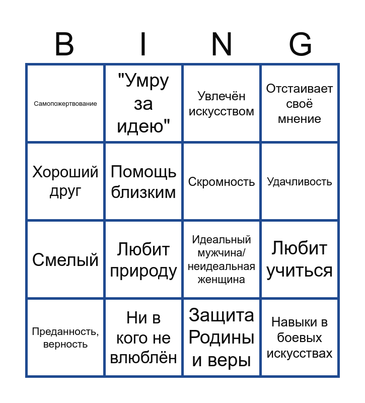 This bingo card has 16 words: Ни в кого не влюблён, Любит учиться, Увлечён искусством, Самопожертвование, Смелый, "Умру за идею", Идеальный мужчина/неидеальная женщина, Защита Родины и веры, Хороший друг, Помощь близким, Преданность, верность, Отстаивает своё мнение, Любит природу, Удачливость, Скромность and Навыки в боевых искусствах.