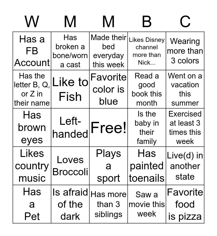 This bingo card has a free space and 24 words: Loves Broccoli, Is afraid of the dark, Favorite color is blue, Has a Pet, Wearing more than 3 colors, Has a FB Account, Has the letter B, Q, or Z in their name, Has broken a bone/worn a cast, Is the baby in their family, Plays a sport, Read a good book this month, Has brown eyes, Has painted toenails, Live(d) in another state, Like to Fish, Saw a movie this week, Exercised at least 3 times this week, Made their bed everyday this week, Went on a vacation this summer, Left-handed, Favorite food is pizza, Likes country music, Likes Disney channel more than Nick... and Has more than 3 siblings.