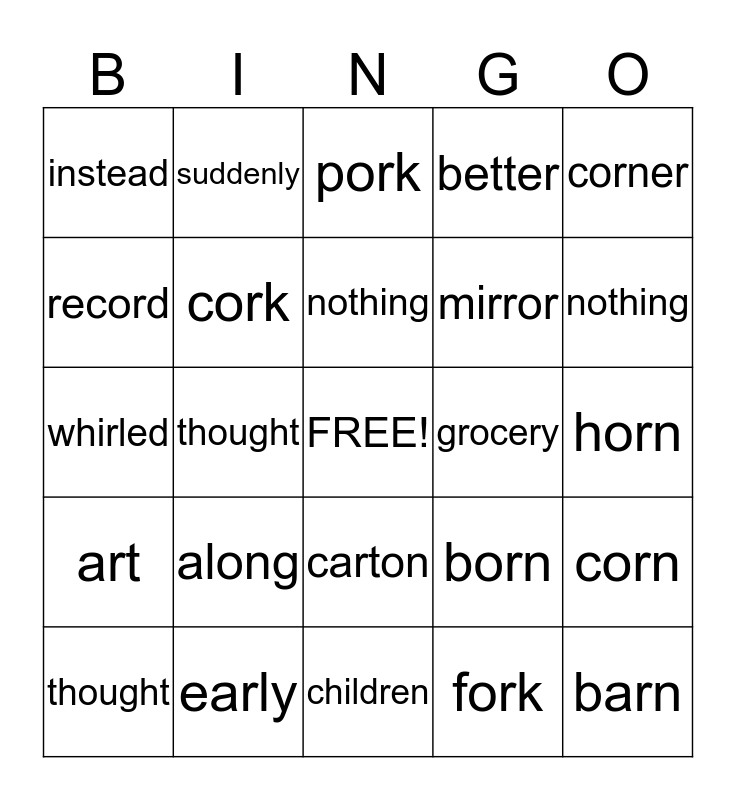 This bingo card has a free space and 24 words: along, early, nothing, thought, corner, instead, record, suddenly, grocery, carton, mirror, whirled, born, corn, cork, fork, horn, pork, nothing, thought, barn, art, better and children.