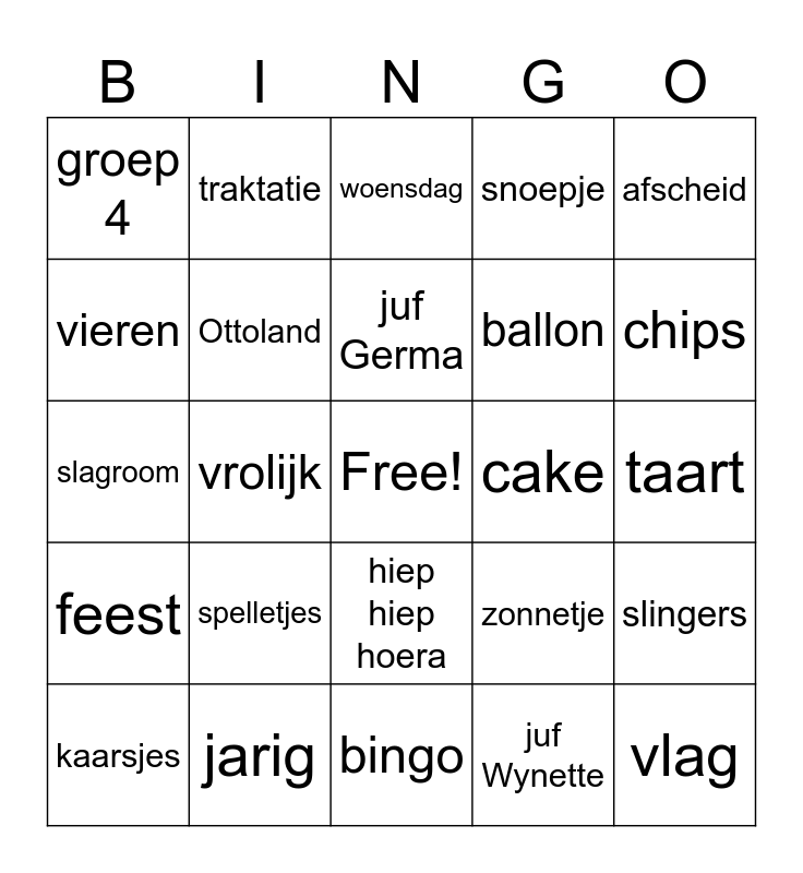 This bingo card has a free space and 26 words: feest, jarig, juf Germa, juf Wynette, afscheid, groep 4, Ottoland, woensdag, ballon, vlag, vieren, vrolijk, zomer, zonnetje, taart, ballonnen, traktatie, hiep hiep hoera, snoepje, slingers, slagroom, spelletjes, bingo, cake, chips and kaarsjes.
