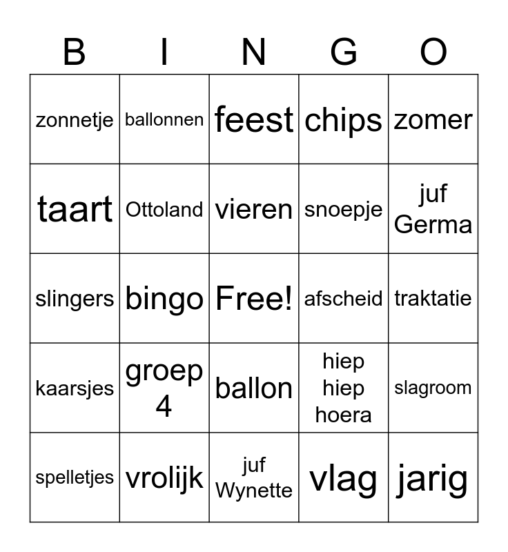 This bingo card has a free space and 26 words: ballon, vlag, vieren, vrolijk, zomer, zonnetje, taart, ballonnen, traktatie, hiep hiep hoera, snoepje, slingers, slagroom, spelletjes, bingo, cake, chips, kaarsjes, feest, jarig, juf Germa, juf Wynette, afscheid, groep 4, Ottoland and woensdag.