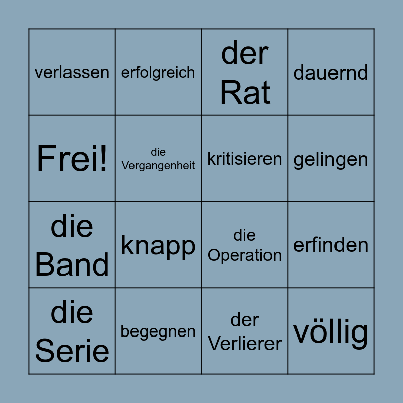 This bingo card has 16 words: begegnen, erfinden, der Rat, verlassen, die Band, erfolgreich, die Operation, der Verlierer, Frei!, die Vergangenheit, die Serie, dauernd, knapp, gelingen, kritisieren and völlig.