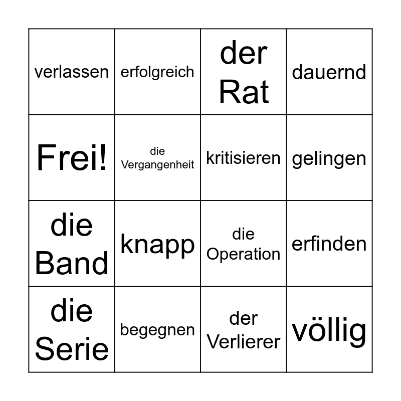 This bingo card has 16 words: begegnen, erfinden, der Rat, verlassen, die Band, erfolgreich, die Operation, der Verlierer, Frei!, die Vergangenheit, die Serie, dauernd, knapp, gelingen, kritisieren and völlig.