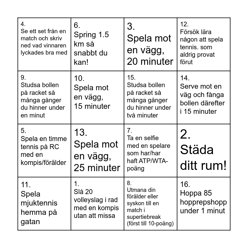 This bingo card has 16 words: 1. Slå 20 volleyslag i rad med en kompis utan att missa, 2. Städa ditt rum!, 3. Spela mot en vägg, 20 minuter, 4. Se ett set från en match och skriv ned vad vinnaren lyckades bra med, 5. Spela en timme tennis på RC med en kompis/förälder, 6. Spring 1.5 km så snabbt du kan!, 7. Ta en selfie med en spelare som har/har haft ATP/WTA-poäng, 8. Utmana din förälder eller syskon till en match i supertiebreak (först till 10-poäng), 9. Studsa bollen på racket så många gånger du hinner under en minut, 10. Spela mot en vägg, 15 minuter, 11. Spela mjuktennis hemma på gatan, 12. Försök lära någon att spela tennis. som aldrig provat förut, 13. Spela mot en vägg, 25 minuter, 14. Serve mot en väg och fånga bollen därefter i 15 minuter, 15. Studsa bollen på racket så många gånger du hinner under två minuter and 16. Hoppa 85 hopprepshopp under 1 minut.