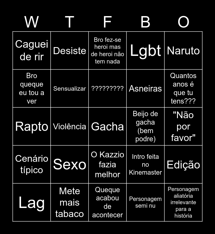 This bingo card has a free space and 24 words: Sexo, Mete mais tabaco, ?????????, Lag, Naruto, Caguei de rir, Bro queque eu tou a ver, Desiste, Beijo de gacha (bem podre), O Kazzio fazia melhor, Asneiras, Rapto, Intro feita no Kinemaster, Edição, Sensualizar, Personagem semi nu, "Não por favor", Bro fez-se heroi mas de heroi não tem nada, Quantos anos é que tu tens???, Violência, Personagem aliatória irrelevante para a história, Cenário típico, Lgbt and Queque acabou de acontecer.