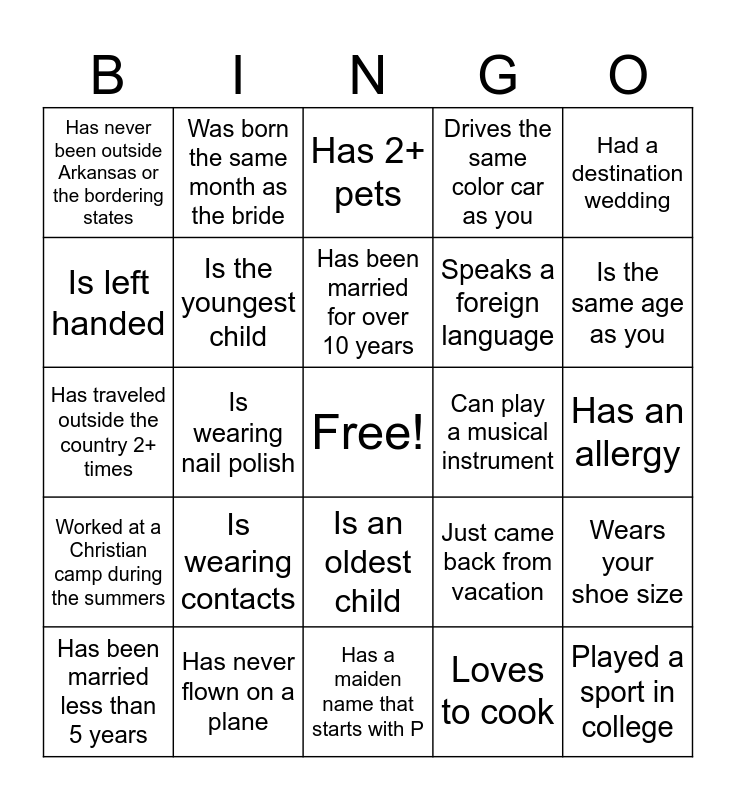 This bingo card has a free space and 25 words: Is wearing contacts, Has a maiden name that starts with P, Has been married for over 10 years, Has been married less than 5 years, Had a destination wedding, Has never been outside Arkansas or the bordering states, Is left handed, Was born the same month as the bride, Can play a musical instrument, Is an oldest child, Speaks a foreign language, Has traveled outside the country 2+ times, Just came back from vacation, Wears your shoe size, Is the youngest child, Doesn't drink coffee, Has an allergy, Has 2+ pets, Is the same age as you, Is wearing nail polish, Played a sport in college, Has never flown on a plane, Worked at a Christian camp during the summers, Drives the same color car as you and Loves to cook.