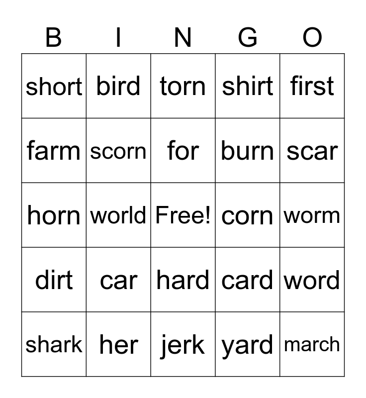 This bingo card has a free space and 24 words: car, her, for, shark, first, short, farm, bird, corn, hard, burn, horn, card, word, scorn, yard, worm, torn, scar, world, march, dirt, shirt and jerk.