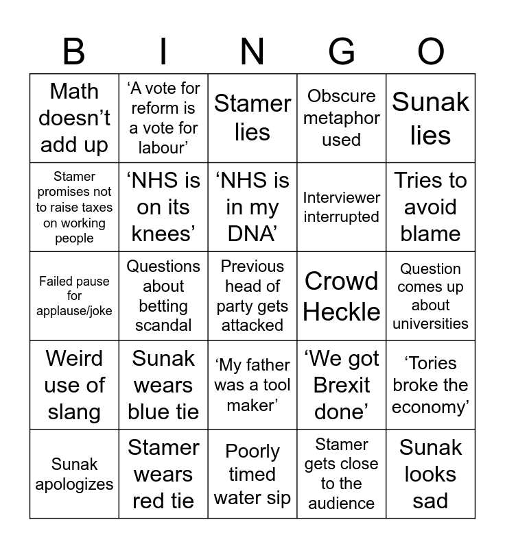 This bingo card has a free space and 24 words: Sunak wears blue tie, Stamer wears red tie, ‘NHS is in my DNA’, Sunak apologizes, Sunak lies, Math doesn’t add up, Stamer promises not to raise taxes on working people, ‘A vote for reform is a vote for labour’, Crowd Heckle, ‘My father was a tool maker’, Interviewer interrupted, Failed pause for applause/joke, ‘We got Brexit done’, ‘Tories broke the economy’, ‘NHS is on its knees’, Stamer gets close to the audience, Question comes up about universities, Stamer lies, Tries to avoid blame, Questions about betting scandal, Sunak looks sad, Weird use of slang, Obscure metaphor used and Poorly timed water sip.