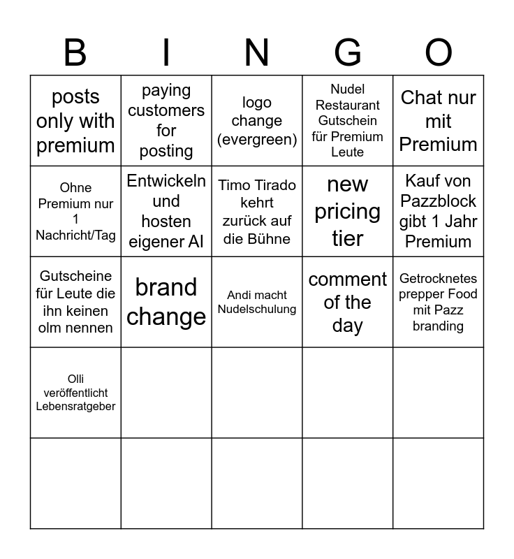 This bingo card has 16 words: comment of the day, brand change, logo change (evergreen), posts only with premium, new pricing tier, paying customers for posting, Gutscheine für Leute die ihn keinen olm nennen, Getrocknetes prepper Food mit Pazz branding, Chat nur mit Premium, Ohne Premium nur 1 Nachricht/Tag, Andi macht Nudelschulung, Nudel Restaurant Gutschein für Premium Leute, Kauf von Pazzblock gibt 1 Jahr Premium, Timo Tirado kehrt zurück auf die Bühne, Entwickeln und hosten eigener AI and Olli veröffentlicht Lebensratgeber.
