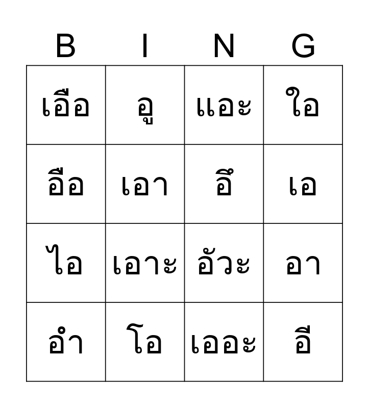 This bingo card has 33 words: Free!, อะ, อา, ิอิ, อี, อึ, อือ, อุ, อู, เอะ, เอ, แอะ, แอ, โอะ, โอ, เอาะ, ออ, อัวะ, อัว, เอียะ, เอีย, เอือะ, เอือ, เออะ, เออ, อำ, ใอ, ไอ, เอา, ฤ, ฤา, ฦ and ฦา.