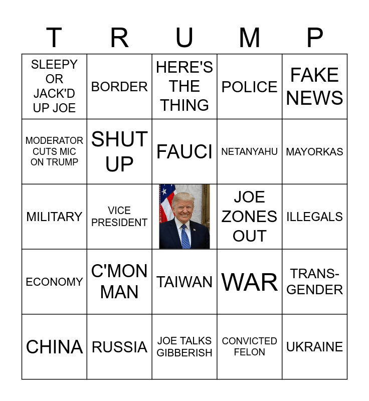 This bingo card has a free space and 24 words: CHINA, C'MON MAN, FAUCI, CONVICTED FELON, FAKE NEWS, SLEEPY OR JACK'D UP JOE, BORDER, HERE'S THE THING, JOE ZONES OUT, ILLEGALS, MILITARY, SHUT UP, WAR, TRANS-GENDER, MODERATOR CUTS MIC ON TRUMP, RUSSIA, JOE TALKS GIBBERISH, POLICE, MAYORKAS, ECONOMY, VICE PRESIDENT, TAIWAN, NETANYAHU and UKRAINE.