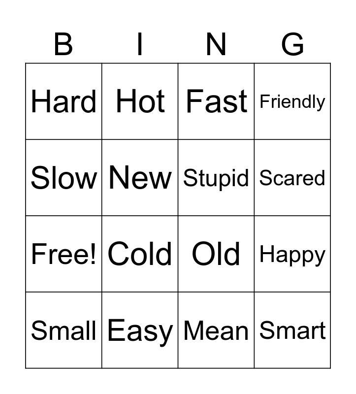 This bingo card has 20 words: Happy, Sad, Fast, Big, Small, Slow, Easy, Hard, Free!, Hot, Cold, Old, New, Smart, Stupid, Beautiful, Scared, Friendly, Mean and Funny.