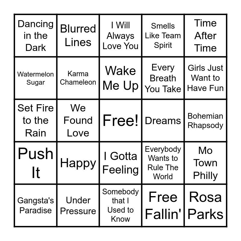 This bingo card has a free space and 24 words: Happy, Under Pressure, Wake Me Up, Gangsta's Paradise, Time After Time, Dancing in the Dark, Watermelon Sugar, Blurred Lines, Dreams, I Gotta Feeling, Every Breath You Take, Set Fire to the Rain, Everybody Wants to Rule The World, Mo Town Philly, Karma Chameleon, Free Fallin', Bohemian Rhapsody, I Will Always Love You, Girls Just Want to Have Fun, We Found Love, Rosa Parks, Push It, Smells Like Team Spirit and Somebody that I Used to Know.