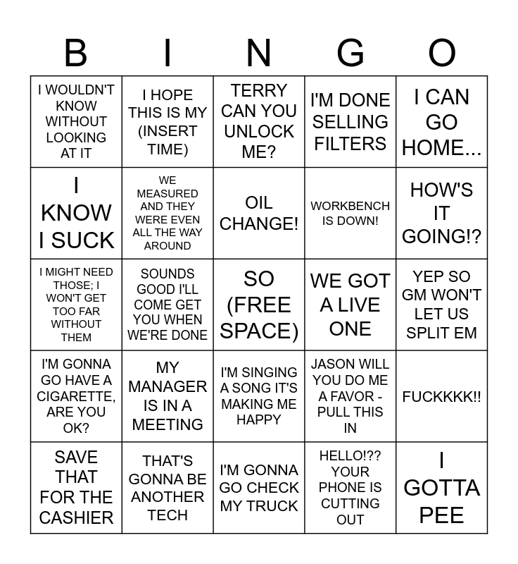 This bingo card has a free space and 24 words: MY MANAGER IS IN A MEETING, THAT'S GONNA BE ANOTHER TECH, OIL CHANGE!, SAVE THAT FOR THE CASHIER, I CAN GO HOME..., I WOULDN'T KNOW WITHOUT LOOKING AT IT, I KNOW I SUCK, I HOPE THIS IS MY (INSERT TIME), WE GOT A LIVE ONE, I'M SINGING A SONG IT'S MAKING ME HAPPY, WORKBENCH IS DOWN!, I MIGHT NEED THOSE; I WON'T GET TOO FAR WITHOUT THEM, JASON WILL YOU DO ME A FAVOR - PULL THIS IN, FUCKKKK!!, WE MEASURED AND THEY WERE EVEN ALL THE WAY AROUND, HELLO!?? YOUR PHONE IS CUTTING OUT, YEP SO GM WON'T LET US SPLIT EM, TERRY CAN YOU UNLOCK ME?, HOW'S IT GOING!?, SOUNDS GOOD I'LL COME GET YOU WHEN WE'RE DONE, I GOTTA PEE, I'M GONNA GO HAVE A CIGARETTE, ARE YOU OK?, I'M DONE SELLING FILTERS and I'M GONNA GO CHECK MY TRUCK.