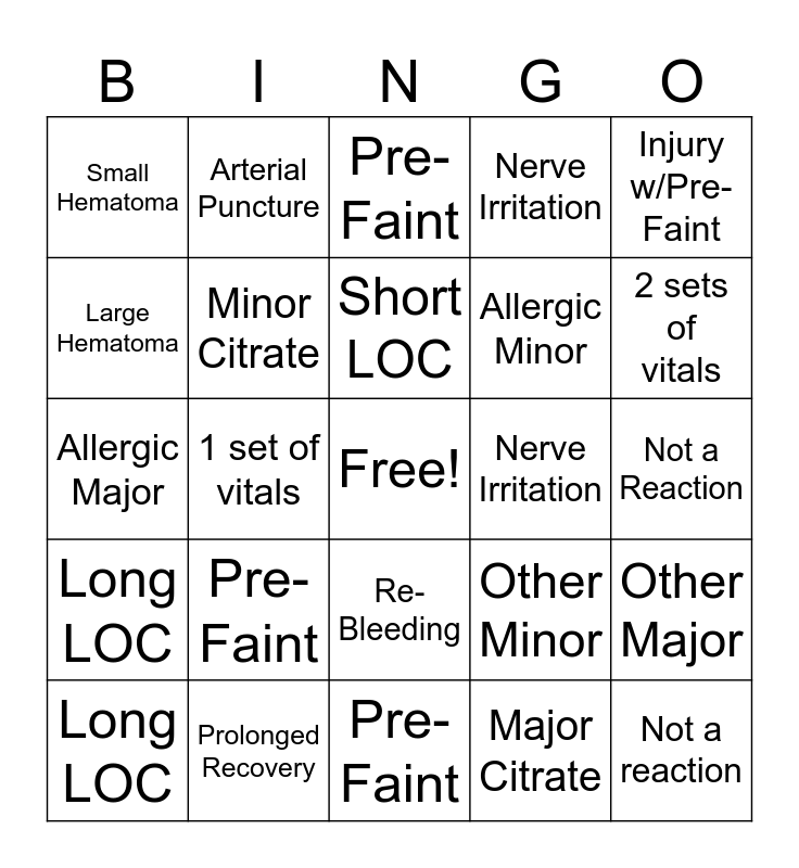 This bingo card has a free space and 24 words: Pre-Faint, Prolonged Recovery, Short LOC, Long LOC, Injury w/Pre-Faint, Small Hematoma, Large Hematoma, Arterial Puncture, Nerve Irritation, Re-Bleeding, Allergic Minor, Allergic Major, Other Minor, Other Major, Minor Citrate, Major Citrate, Not a Reaction, Pre-Faint, 2 sets of vitals, 1 set of vitals, Not a reaction, Long LOC, Nerve Irritation and Pre-Faint.