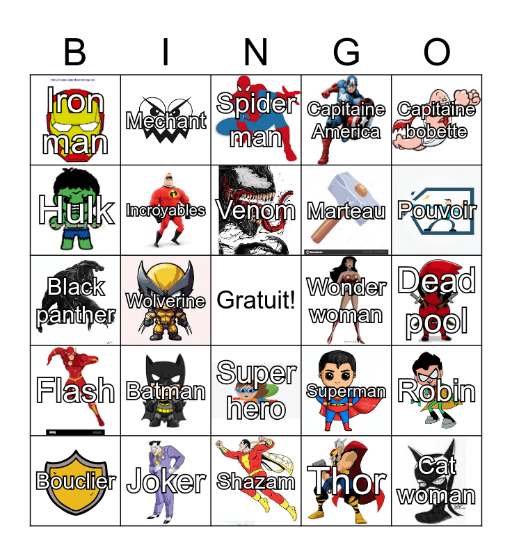 This bingo card has 24 images, a free space and 24 words: Batman, Joker, Venom, Bouclier, Capitaine bobette, Iron man, Hulk, Mechant, Wonder woman, Super hero, Marteau, Black panther, Superman, Robin, Incroyables, Thor, Dead pool, Spider man, Pouvoir, Wolverine, Cat woman, Flash, Capitaine America and Shazam.