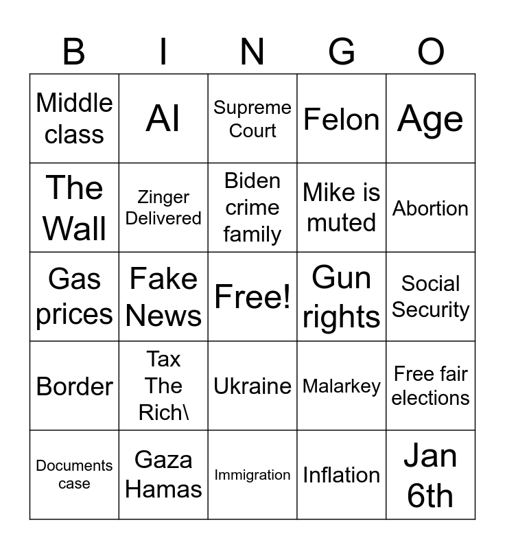 This bingo card has a free space and 44 words: Putin, Jan 6th, Fentanyl, Documents case, Israel, Inflation, Supreme Court, MAGA, Age, Gaza Hamas, Felon, Gun rights, Ukraine, Tax The Rich\, Climate change, Immigration, Democracy, Gas prices, Veterans, Abortion, AI, Hunter Biden, Student Loan Forgiveness, Middle class, Scrappy Joe from Scranton, Social Security, Affordable health care, Sleepy Joe, Malarkey, Border, 34 Felony Convictions, Free fair elections, Chyna!, Dr. Fauci, Fake News, ‘Election interference’, Jan 6th, Witch Hunt, Biden crime family, The Wall, Mike is muted, 1st Amendment, Zinger Delivered and “Yuge”.