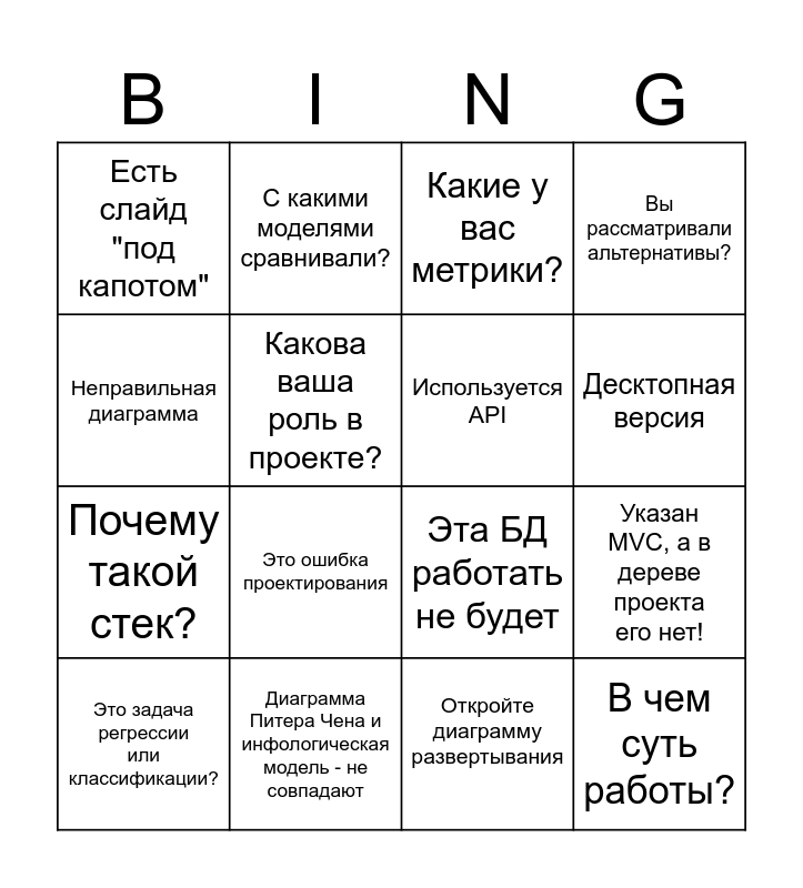 This bingo card has 16 words: Диаграмма Питера Чена и инфологическая модель - не совпадают, Указан MVC, а в дереве проекта его нет!, Какие у вас метрики?, Есть слайд "под капотом", Почему такой стек?, С какими моделями сравнивали?, Эта БД работать не будет, Откройте диаграмму развертывания, Неправильная диаграмма, Какова ваша роль в проекте?, Это задача регрессии или классификации?, Вы рассматривали альтернативы?, Это ошибка проектирования, Десктопная версия, Используется API and В чем суть работы?.