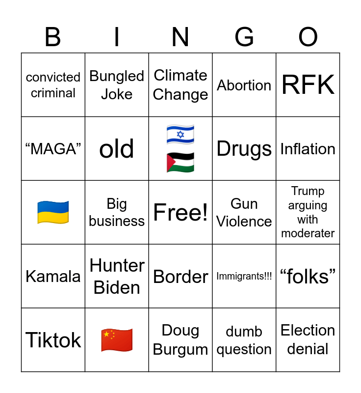 This bingo card has a free space and 24 words: Hunter Biden, 🇨🇳, 🇮🇱🇵🇸, Tiktok, RFK, convicted criminal, “MAGA”, Bungled Joke, Gun Violence, Border, Drugs, 🇺🇦, Immigrants!!!, “folks”, old, dumb question, Trump arguing with moderater, Climate Change, Inflation, Big business, Election denial, Kamala, Abortion and Doug Burgum.