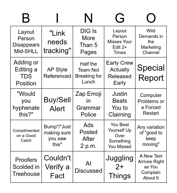 This bingo card has a free space and 24 words: Bump"/"Just making sure you saw this", Couldn't Verify a Fact, Half the Team Not Breaking for Lunch, Proofers Scolded in Treehouse, Wild Demands in the Marketing Channel, Layout Person Disappears Mid-SHLL, Adding or Editing a TDS Position, "Link needs tracking", Justin Beats You to Claiming, Ads Posted After 2 p.m., Early Crew Actually Released Early, "Would you hyphenate this?", You Beat Yourself Up Over Something You Missed, Any variation of "good to keep moving", AP Style Referenced, Juggling 2+ Things, Computer Problems or a Forced Restart, DIG Is More Than 5 Pages, Special Report, Buy/Sell Alert, A New Test Arrives Right as You Complain About It, Complimented on a Good Catch, Layout Person Misses Your Edit 2+ Times and AI Discussed.