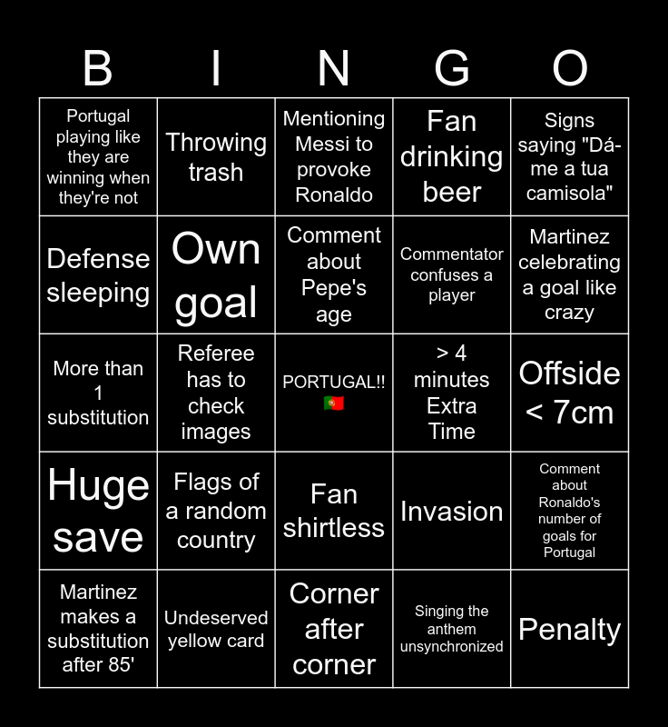 This bingo card has a free space and 24 words: Flags of a random country, Undeserved yellow card, Comment about Pepe's age, Martinez makes a substitution after 85', Signs saying "Dá-me a tua camisola", Portugal playing like they are winning when they're not, Defense sleeping, Throwing trash, > 4 minutes Extra Time, Fan shirtless, Commentator confuses a player, More than 1 substitution, Invasion, Comment about Ronaldo's number of goals for Portugal, Own goal, Singing the anthem unsynchronized, Offside < 7cm, Mentioning Messi to provoke Ronaldo, Martinez celebrating a goal like crazy, Referee has to check images, Penalty, Huge save, Fan drinking beer and Corner after corner.