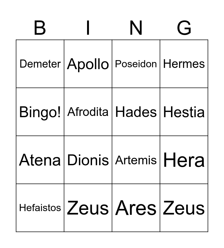 This bingo card has 16 words: Zeus, Hera, Poseidon, Demeter, Atena, Apollo, Artemis, Ares, Bingo!, Afrodita, Hefaistos, Hermes, Dionis, Hestia, Hades and Zeus.