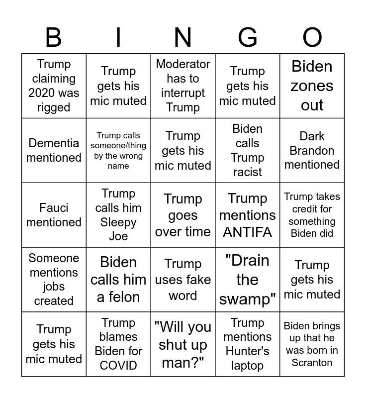 This bingo card has a free space and 29 words: Trump gets his mic muted, Biden calls someone/thing by the wrong name, Trump calls him Sleepy Joe, Trump claiming his trial(s) was rigged, Trump claiming 2020 was rigged, Moderator has to interrupt Trump, Trump calls someone/thing by the wrong name, Biden calls him a felon, Trump mentions ANTIFA, Trump blames Biden for COVID, Trump takes credit for something Biden did, Biden brings up that he was born in Scranton, "Will you shut up man?", Trump mentions Hunter's laptop, Dark Brandon mentioned, There's a fly, Trump uses fake word, Someone mentions jobs created, Biden zones out, Fauci mentioned, "Drain the swamp", Trump encourages violence, Biden calls Trump racist, Dementia mentioned, Trump gets his mic muted, Trump gets his mic muted, Trump gets his mic muted, Trump gets his mic muted and Trump gets his mic muted.