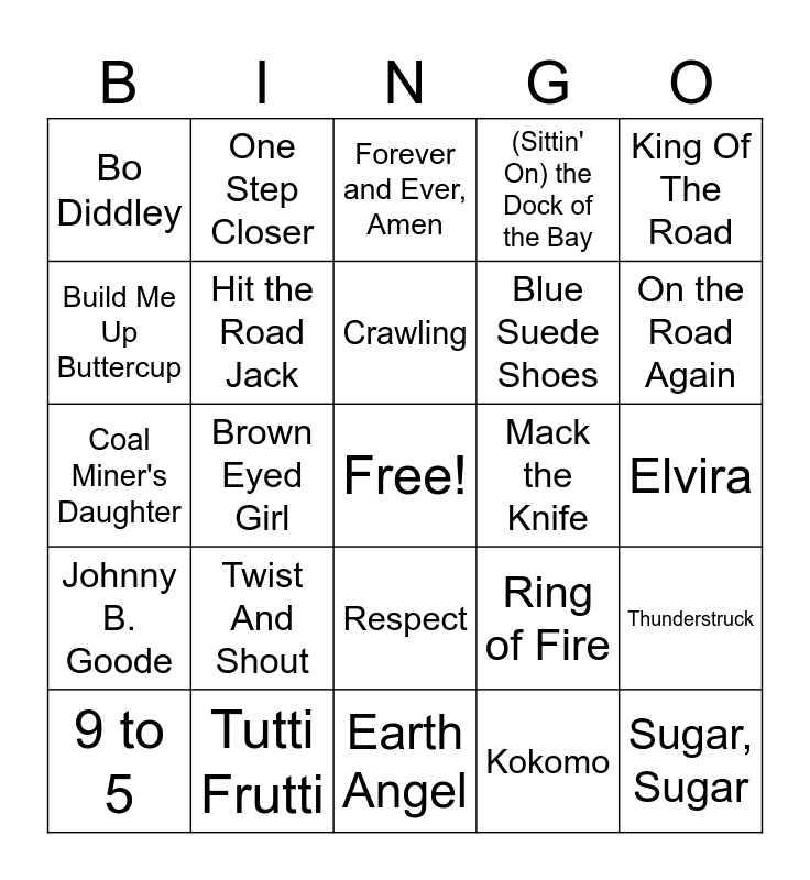 This bingo card has a free space and 29 words: 9 to 5, Can't Help Falling in Love, Brown Eyed Girl, Wake up Little Susie, Bo Diddley, Forever and Ever, Amen, Hit the Road Jack, Twist And Shout, Mack the Knife, Tutti Frutti, Elvira, Sugar, Sugar, Earth Angel, Kokomo, On the Road Again, Sweet Caroline, Respect, Johnny B. Goode, King Of The Road, Coal Miner's Daughter, Ring of Fire, Hound Dog, Blue Suede Shoes, Build Me Up Buttercup, (Sittin' On) the Dock of the Bay, One Step Closer, Thunderstruck, Crawling and Enter Sandman.