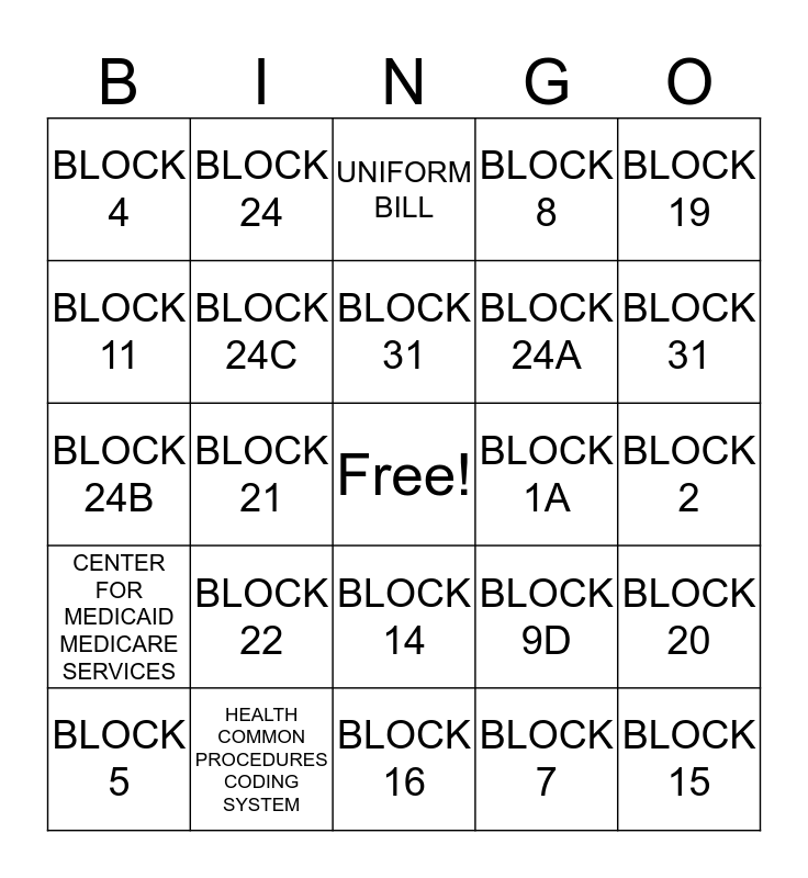 This bingo card has a free space and 24 words: BLOCK 22, HEALTH COMMON PROCEDURES CODING SYSTEM, BLOCK 31, BLOCK 5, BLOCK 19, BLOCK 4, BLOCK 11, BLOCK 24, BLOCK 1A, BLOCK 14, BLOCK 24A, BLOCK 24B, BLOCK 9D, BLOCK 20, BLOCK 24C, BLOCK 7, BLOCK 2, UNIFORM BILL, BLOCK 31, BLOCK 21, BLOCK 15, CENTER FOR MEDICAID MEDICARE SERVICES, BLOCK 8 and BLOCK 16.