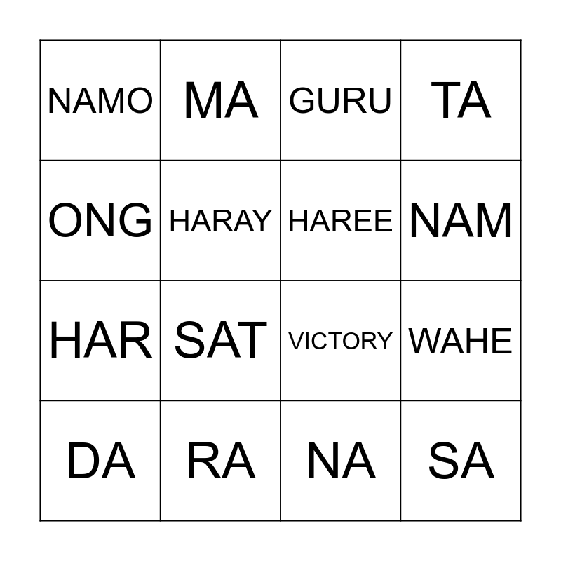 This bingo card has 16 words: RA, WAHE, GURU, NAMO, HAR, MA, VICTORY, NA, ONG, HARAY, DA, TA, SAT, NAM, HAREE and SA.