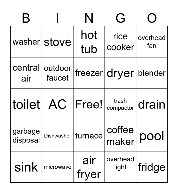 This bingo card has a free space and 24 words: Dishwasher, microwave, freezer, sink, overhead fan, washer, central air, stove, trash compactor, furnace, dryer, toilet, coffee maker, pool, outdoor faucet, overhead light, drain, hot tub, blender, AC, fridge, garbage disposal, rice cooker and air fryer.