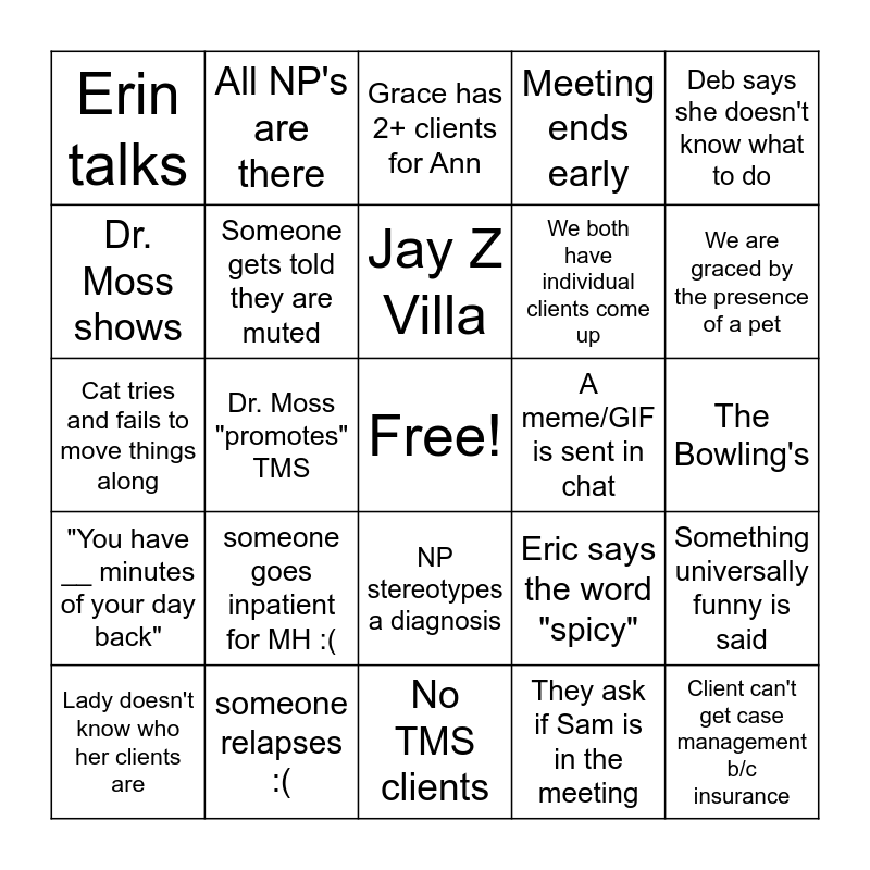 This bingo card has a free space and 24 words: someone goes inpatient for MH :(, someone relapses :(, Jay Z Villa, Lady doesn't know who her clients are, Deb says she doesn't know what to do, Erin talks, Dr. Moss shows, All NP's are there, A meme/GIF is sent in chat, NP stereotypes a diagnosis, We both have individual clients come up, Cat tries and fails to move things along, Eric says the word "spicy", Something universally funny is said, Someone gets told they are muted, They ask if Sam is in the meeting, The Bowling's, Grace has 2+ clients for Ann, We are graced by the presence of a pet, Dr. Moss "promotes" TMS, Client can't get case management b/c insurance, "You have __ minutes of your day back", Meeting ends early and No TMS clients.