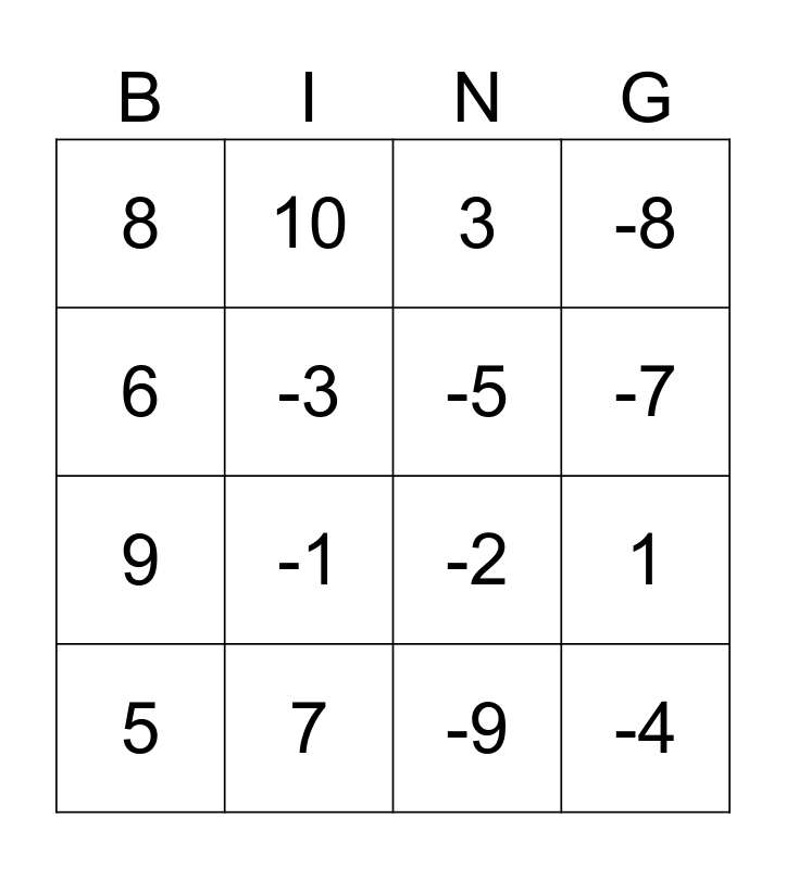 This bingo card has 20 words: 1, 2, 3, 4, 5, 6, 7, 8, 9, 10, -1, -2, -3, -4, -5, -6, -7, -8, -9 and -10.