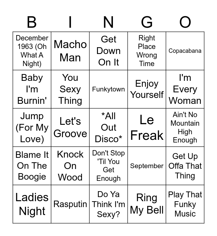 This bingo card has a free space and 33 words: Got To Be Real, Celebration, Let's Groove, Heart Of Glass, Blame It On The Boogie, You Sexy Thing, Copacabana, Ladies Night, Macho Man, Don't Go Breaking My Heart, Funkytown, Get Down On It, It's Raining Men, Sunny, Le Freak, I'm Every Woman, Rasputin, Jump (For My Love), Knock On Wood, September, Don't Stop 'Til You Get Enough, SOS, December 1963 (Oh What A Night), Ain't No Mountain High Enough, Do Ya Think I'm Sexy?, Play That Funky Music, Right Place Wrong Time, Enjoy Yourself, Baby I'm Burnin', Get Up Offa That Thing, Heart Of Glass, Ring My Bell and Fernando.