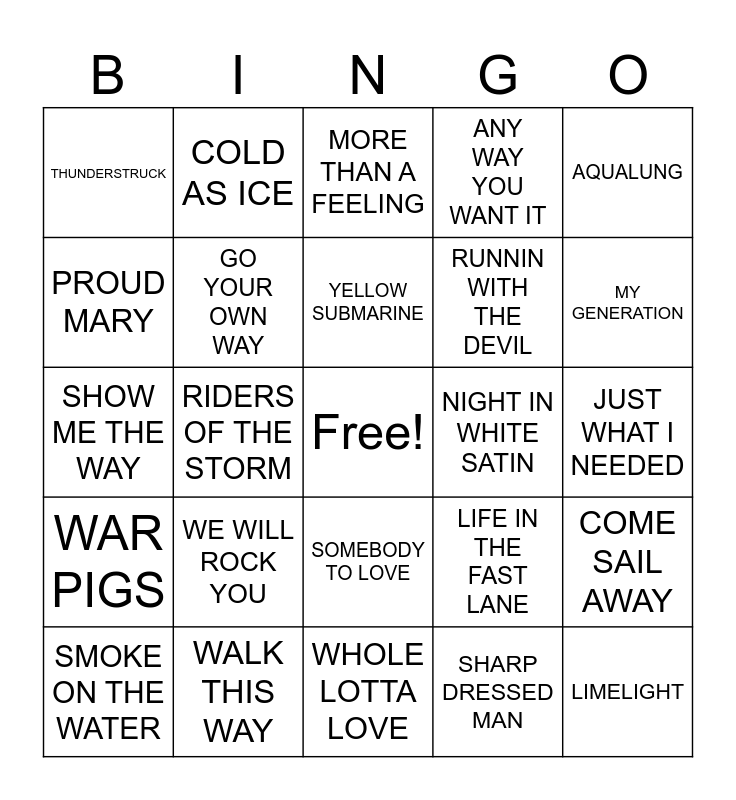 This bingo card has a free space and 31 words: WHOLE LOTTA LOVE, THAT'S ALL, RIDERS OF THE STORM, LONG TRAIN RUNNIN, THUNDERSTRUCK, MORE THAN A FEELING, GO YOUR OWN WAY, LIFE IN THE FAST LANE, NIGHT IN WHITE SATIN, SHARP DRESSED MAN, JUST WHAT I NEEDED, LIMELIGHT, WALK OF LIFE, ENTER SANDMAN, MY GENERATION, BAD COMPANY, COME SAIL AWAY, WE WILL ROCK YOU, WAR PIGS, SOMEBODY TO LOVE, AQUALUNG, BEAST OF BURDEN, SMOKE ON THE WATER, COLD AS ICE, RUNNIN WITH THE DEVIL, PROUD MARY, ANY WAY YOU WANT IT, SHOW ME THE WAY, WALK THIS WAY, YELLOW SUBMARINE and ROCK THE CASBAH.