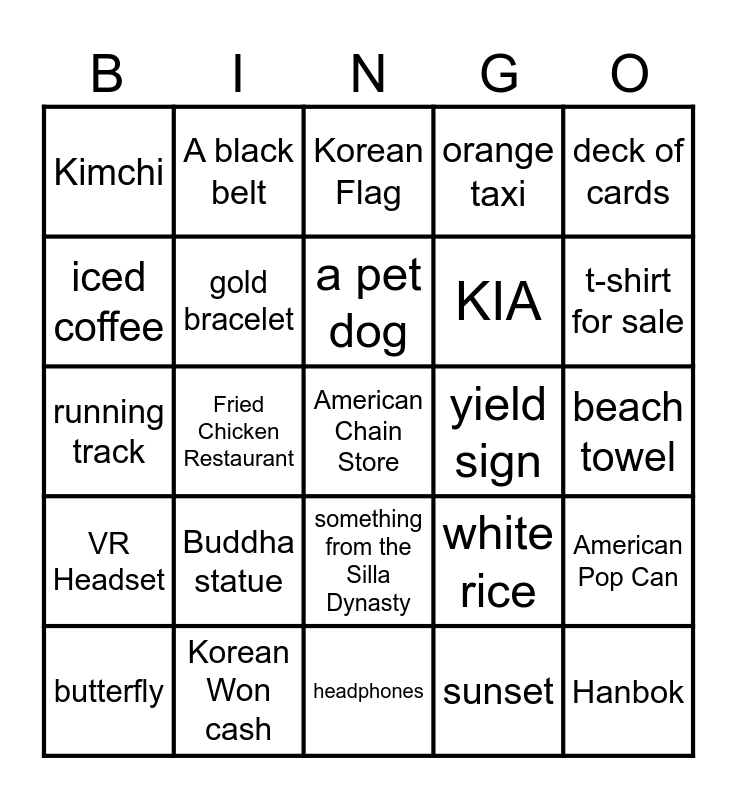 This bingo card has 45 words: Bridge, Fried Chicken Restaurant, Fluorescent sign, Department store, Hanbok, chopsticks, A black belt, A sidekick statue, KIA, American Pop Can, iced coffee, Buddha statue, a pet dog, white rice, pedestrian walk road sign, selfies with 10 people in group, TKD performance, Korean Flag, N Tower, t-shirt for sale, Kimchi, 7-11, American Chain Store, orange taxi, Canadian Flag, butterfly, a river, temple, sunset, beach towel, market stand selling fish, Korean Won cash, something from the Silla Dynasty, sunglasses, red chair, VR Headset, TKD uniform, headphones, plane seat, deck of cards, running track, gold bracelet, someone else's waterbottle, yield sign and bicycle.