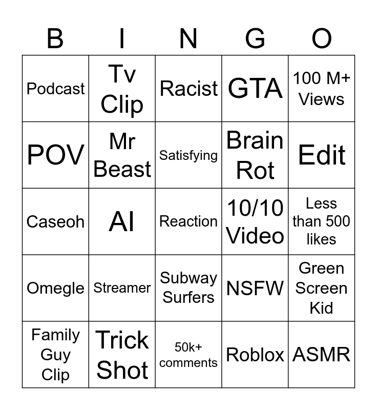 This bingo card has 31 words: Family Guy Clip, Tutorial, Satisfying, Looping, 100 M+ Views, Podcast, Mr Beast, Subway Surfers, Brain Rot, Video from 2022, Omegle, AI, Free!, Roblox, Green Screen Kid, Gameplay, Streamer, Reaction, 10/10 Video, ASMR, POV, Trick Shot, 50k+ comments, GTA, Less than 500 likes, Caseoh, Tv Clip, Racist, NSFW, Edit and Tour.