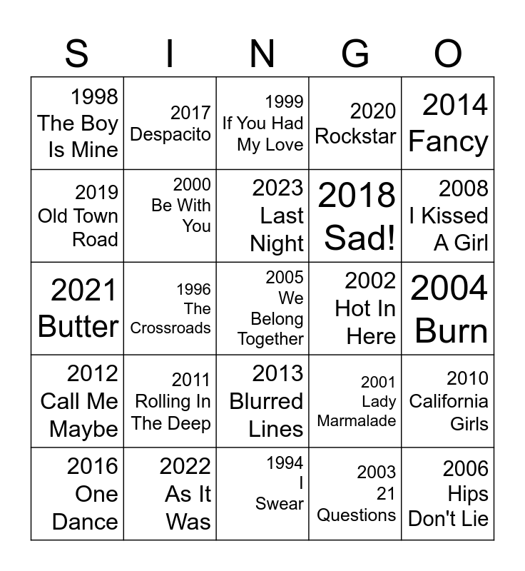 This bingo card has 31 words: 1994 I Swear, 1995 Have You Ever Really Loved A Woman, 1996 The Crossroads, 1997 I'll Be Missing You, 1998 The Boy Is Mine, 1999 If You Had My Love, 2000 Be With You, 2001 Lady Marmalade, 2002 Hot In Here, 2003 21 Questions, 2004 Burn, 2005 We Belong Together, 2006 Hips Don't Lie, 2007 Umbrella, 2008 I Kissed A Girl, 2009 Boom Boom Pow, 2010 California Girls, 2011 Rolling In The Deep, 2012 Call Me Maybe, 2013 Blurred Lines, 2014 Fancy, 2015 See You Again, 2016 One Dance, 2017 Despacito, 2018 Sad!, 2019 Old Town Road, 2020 Rockstar, 2021 Butter, 2022 As It Was, 2023 Last Night and 2024 Please, Please, Please.